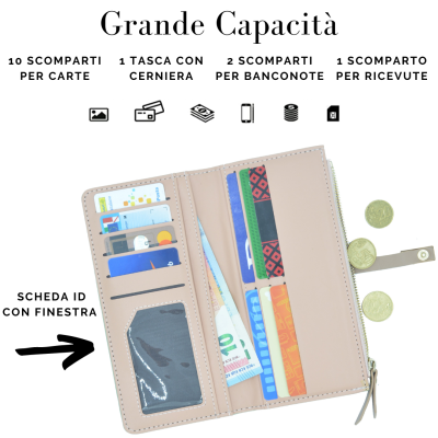 Grande Capacità :Dimensione 19x9x1 (lunghezza x larghezza x altezza). 10 scomparti per carte, 1 tasca con cerniera per monete /cellulare, 2 scomparti per banconote, 1 scomparto per ricevute, 1 finestra per scheda ID / foto
