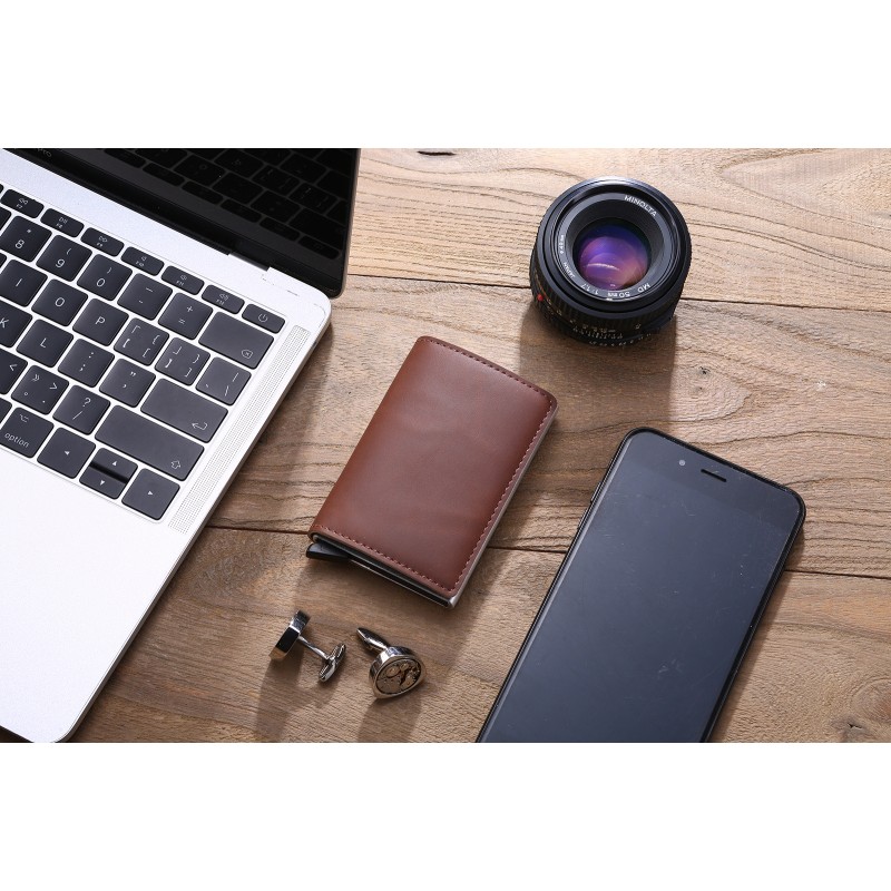 • [TUTTO IN UNO] Portafoglio smart che contiene fino a 9 carte di credito, bancomat o tessere (6/7 nella cassa e 2 nelle tasche interne), con un comodo ferma soldi per le banconote e i biglietti. Munita di meccanismo anticaduta trattiene le carte anche capovolgendo il portafoglio